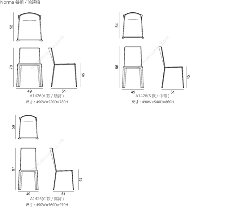 Norma 餐椅/洽谈椅 系列尺寸/示意图