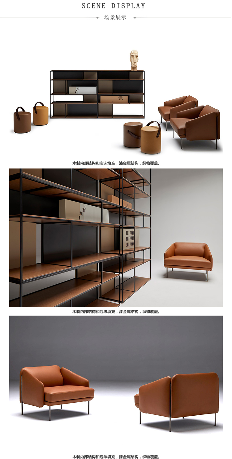 扶手椅和沙发。榉木内框架系带,覆盖多密度泡沫,更加舒适。软垫座椅,靠背和扶手。漆面金属结构。表面处理:金属结构,微纹理漆面。室内装潢皮革。
