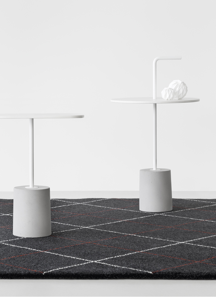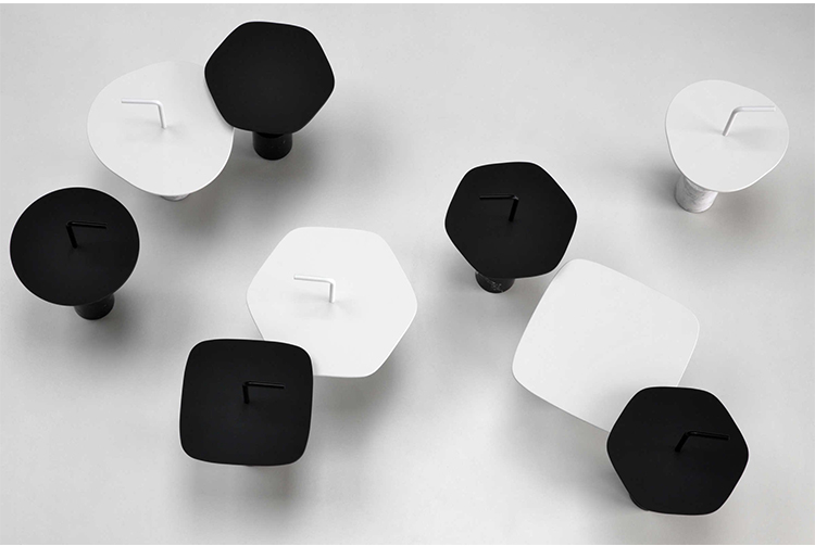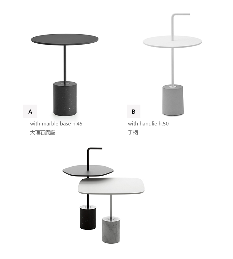 JEY.稳定且可移动。它可以作为一个顶部或便携式的桌子。它有两种不同的高度(45和50厘米)和四种不同的顶部,两种材料和两种颜色。它是一种小型的桌子雕塑,有大理石或水泥底座,管状柱以各种几何图形发展成一个形状的顶部,以一个手柄结束。手柄形状的弯管可以方便地移动桌子,特别是在高频区域(如办公室、酒店、酒吧、餐馆等),但也适用于当代居住环境。它可以与扶手椅、沙发、另一张桌子或另一张Jey相匹配。