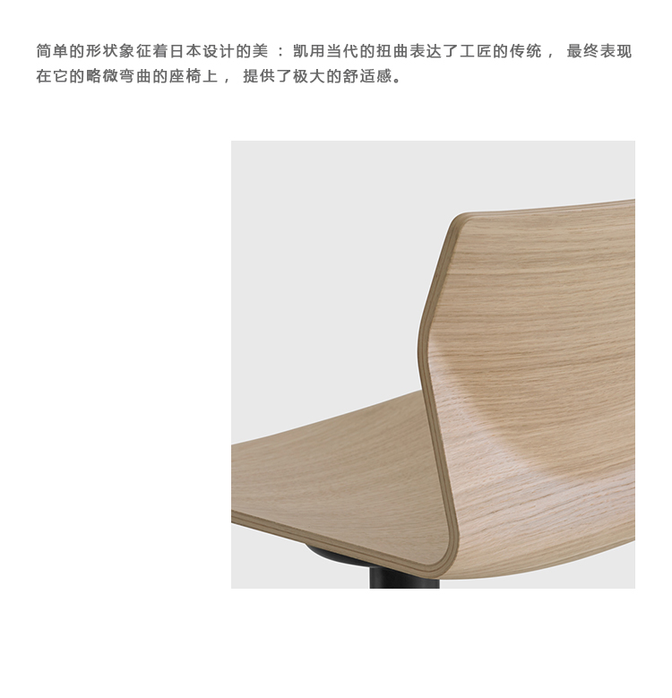 简单的形状象征着日本设计的美:凯用当代的扭曲表达了工匠的传统,最终表现在它的略微弯曲的座椅上,提供了极大的舒适感。