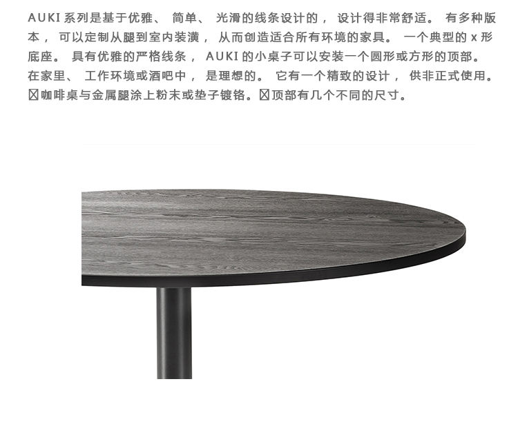 AUKI系列是基于优雅、简单、光滑的线条设计的,设计得非常舒适。有多种版本,可以定制从腿到室内装潢,从而创造适合所有环境的家具。一个典型的x形底座。具有优雅的严格线条,AUKI的小桌子可以安装一个圆形或方形的顶部。在家里、工作环境或酒吧中,是理想的。它有一个精致的设计,供非正式使用。‎咖啡桌与金属腿涂上粉末或垫子镀铬。‎顶部有几个不同的尺寸。