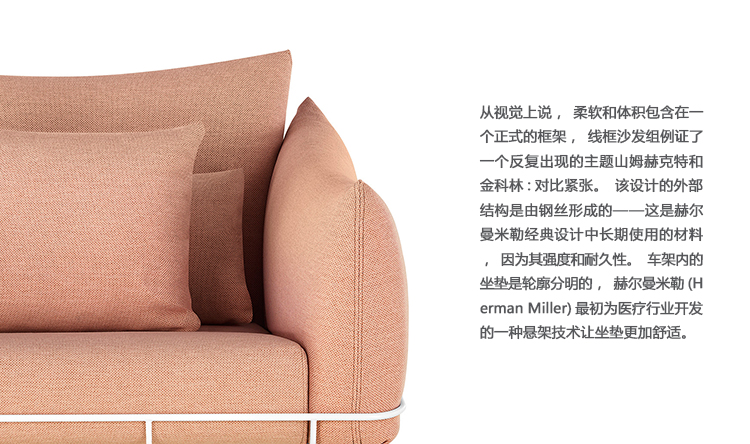 从视觉上说,柔软和体积包含在一个正式的框架,线框沙发组例证了一个反复出现的主题山姆赫克特和金科林:对比紧张。该设计的外部结构是由钢丝形成的——这是赫尔曼米勒经典设计中长期使用的材料,因为其强度和耐久性。车架内的坐垫是轮廓分明的,赫尔曼米勒(Herman Miller)最初为医疗行业开发的一种悬架技术让坐垫更加舒适。腰椎和抱枕是祭品的全部。轻便,大小不一,多用途的座椅可以轻松地变换位置,以满足不断变化的空间需求,以及在其中工作和放松的人。海克特和科林的设计体现了我们今天的生活方式。选择包括白色或黑色框架与多个室内装潢选择在两人和三人座位的沙发