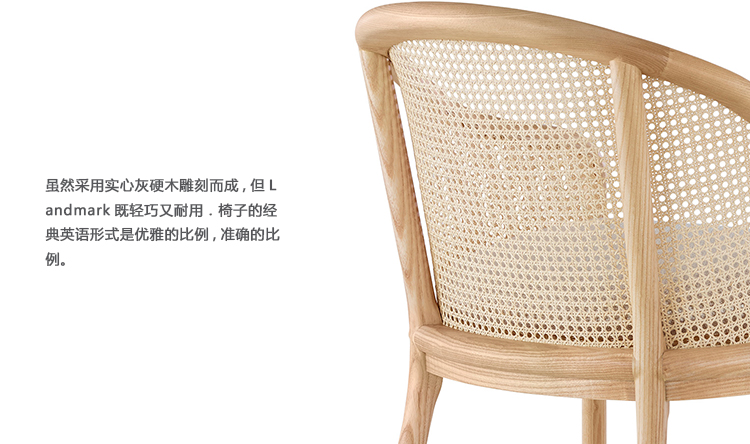 Landmark座椅使用水曲柳实木雕刻而成,既轻巧又耐用。座椅采用经典的英国款式,遵照Bennett绘制的确切比例制造,造型优雅,并配有精致的法国装饰。Landmark的众多装饰变化提供多种选择,可为住宅及工作场所增添舒适及时尚感。