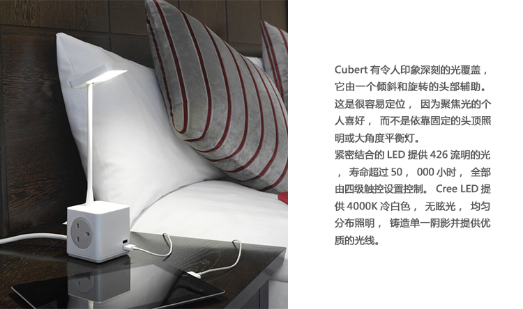 Cubert以集成的形式为个人设备提供电力——将光、USB和AC电力的配置考虑在内,这比以往任何时候都更加紧凑,因此它更容易使用并且占用更少的空间。