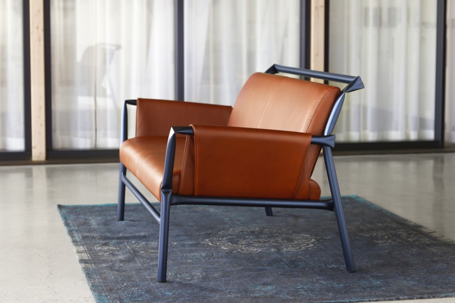 室内躺椅。漆过的“扭结”管状钢。聚氨酯泡沫填充。织物或皮革覆盖物。塑料支脚。座椅高度400毫米。总高度800毫米。总宽度755毫米。座椅深度522毫米。总深度843毫米。