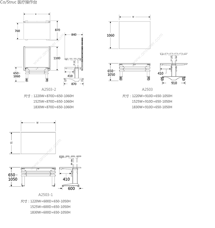Co/Struc 医疗操作台 系列尺寸/示意图
