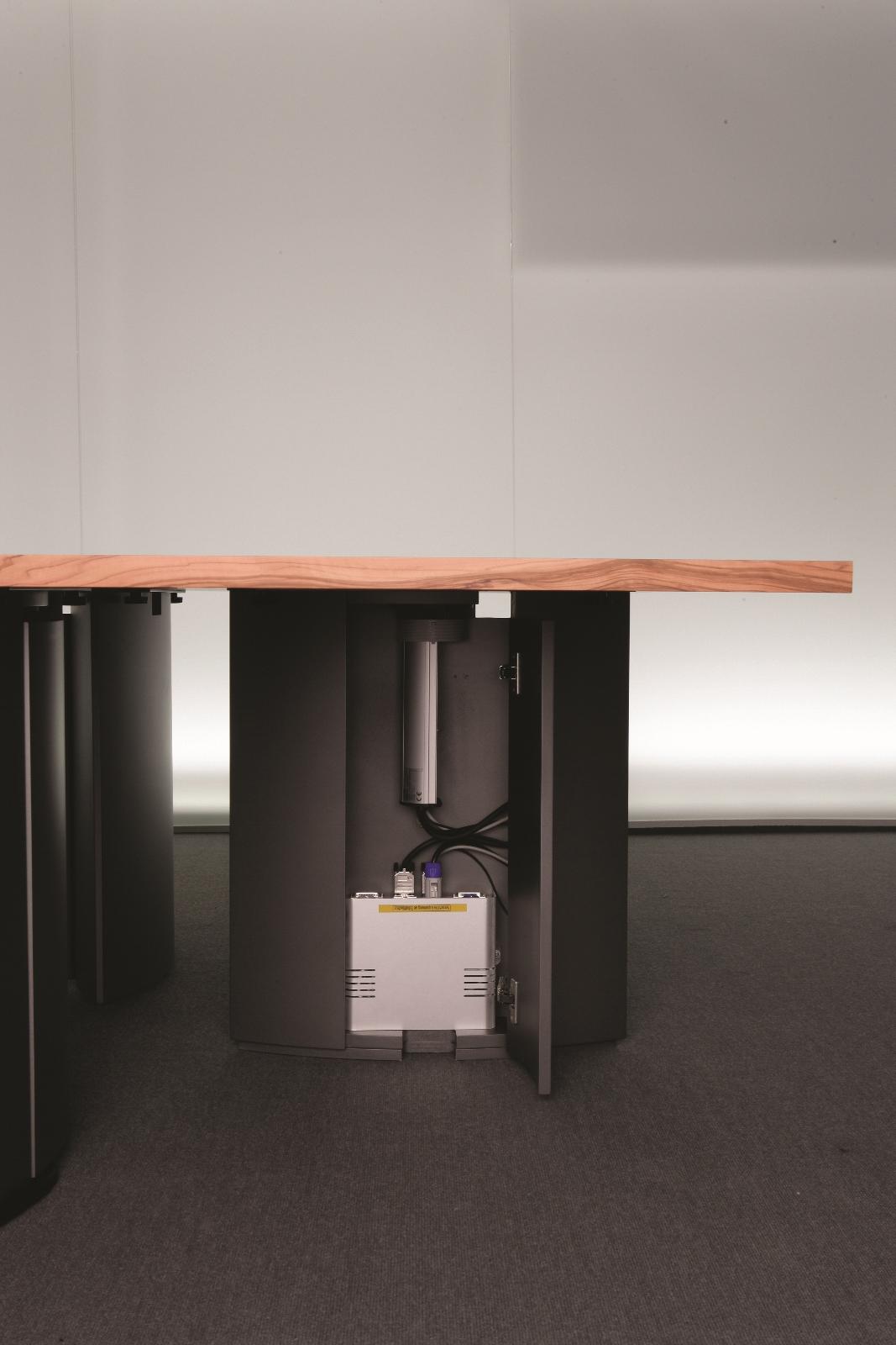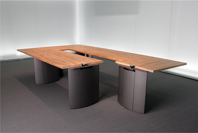 灵活的可变型会议桌系统,看上去像是固定安装的会议桌,且非常稳固。椭圆形的桌腿无需借助任何工具可在短时间内轻松组装和拆卸。32mm厚的桌面、可根据客户需要定制其形状和大小。椭圆形的桌腿可隐藏技术集成和走线系统。