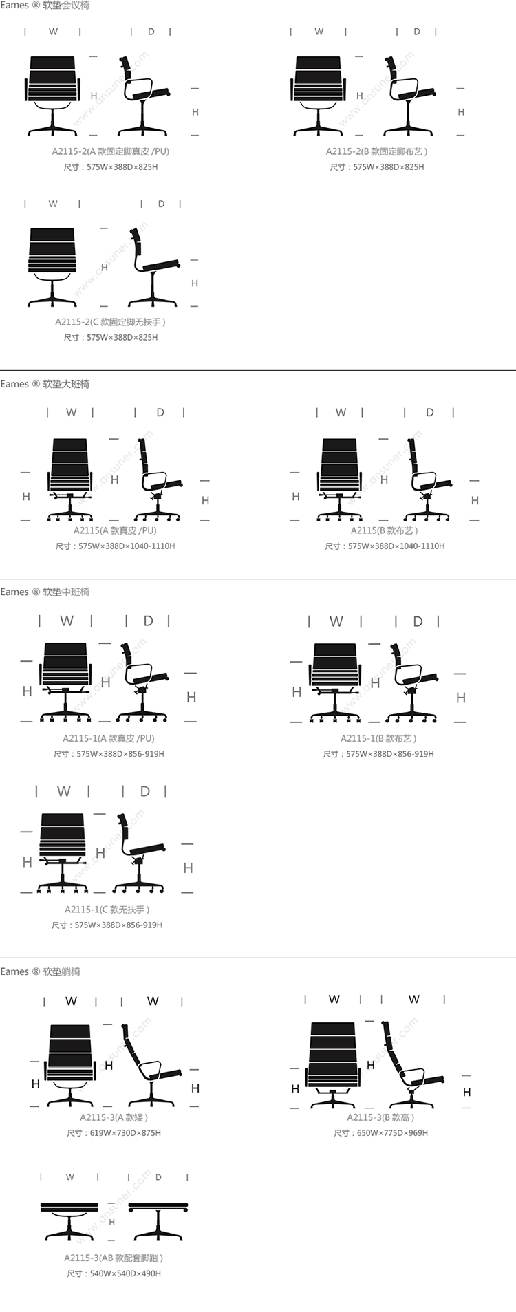 Eames®软垫会议椅 系列尺寸/示意图