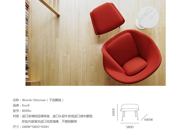 Womb Chair 的基本构造是由抛光镀铬或雾面钢管底座,以一体成型的泡棉包覆框架所组成。 Eero Saarinen 设计这张椅子挑战了一般世俗的规则,打破窠臼,树立了新的现代设计和舒适的标准,充分显示他的高超才华。