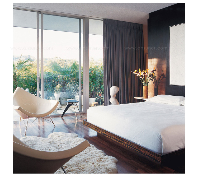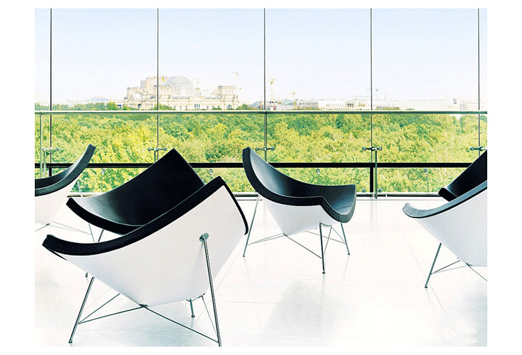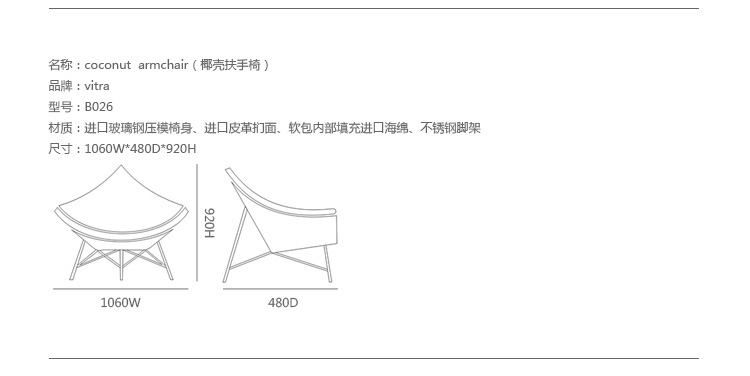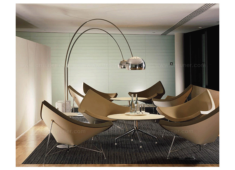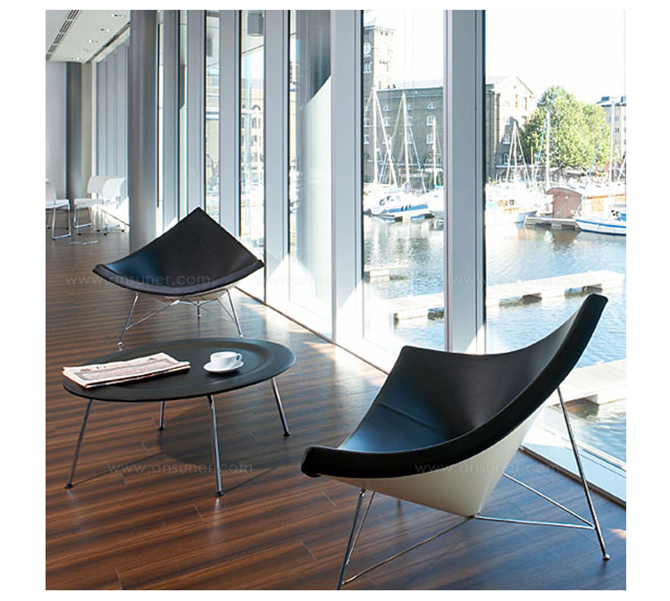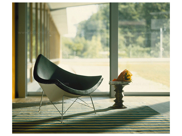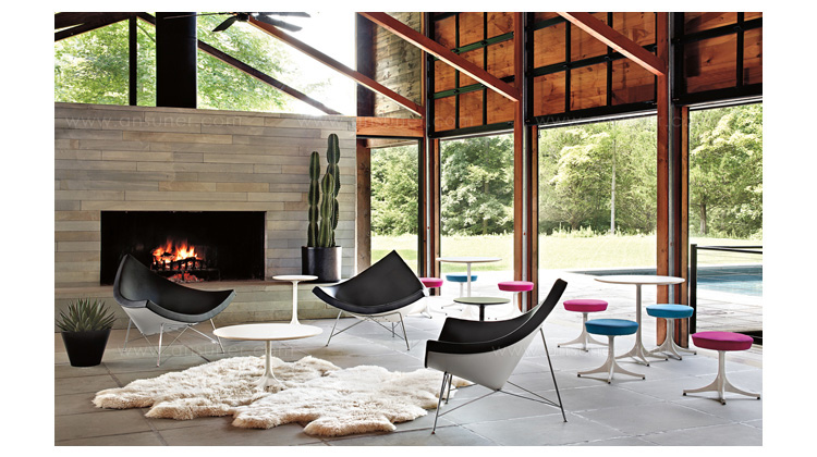 玻璃钢休闲椅——椰子椅(Coconut Chair)是由George Nelson设计工作室创作的。George Nelson将椰子分为八个部分,取其中之一作为椅子的外形。椰子椅(Coconut Chair)凭借着它可爱的造型、精简的结构和极大的视觉冲击力,改变了美式家具的外观和人们对它的印象,成为20世纪50年代的一个设计经典。