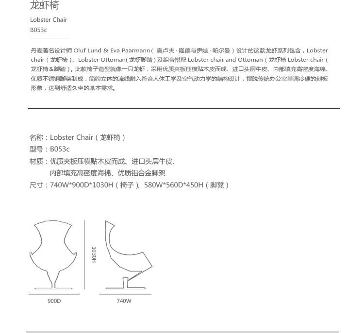 丹麦著名设计师Oluf Lund & Eva Paarmann设计的这款龙虾系列包含,Lobster Chair(龙虾椅)、Lobster Ottoman(龙虾脚踏)及组合搭配Lobster Chair and Ottoman(龙虾椅&脚踏)。此款椅子造型就像一只龙虾,采用优质夹板压模贴木皮而成、进口头层牛皮、内部填充高密度海棉、优质不锈钢脚架制成,简约立体的流线融入符合人体工学及空气动力学的结构设计,摆脱传统办公椅单调冷硬的刻板印象,达到舒适久坐的基本需求。