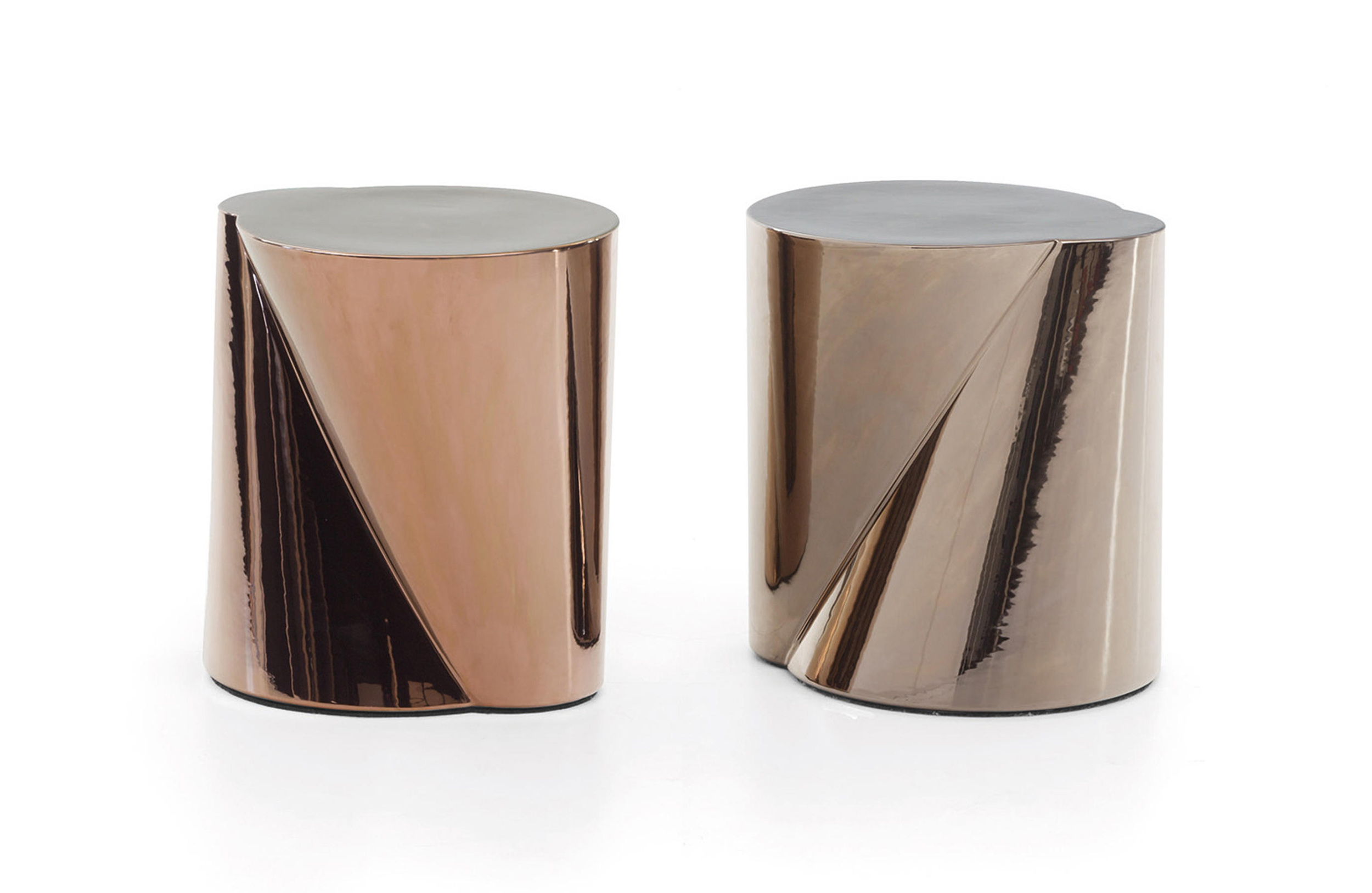 两个锥体连接在一起,打造出造型别具一格的边几,与此同时,两种金属饰面也体现出这款产品的非凡气质:铜色和铂金色。在经过玻璃化的工序之后,陶瓷还要经过进一步烧制,以此来熔化釉面的金属。
