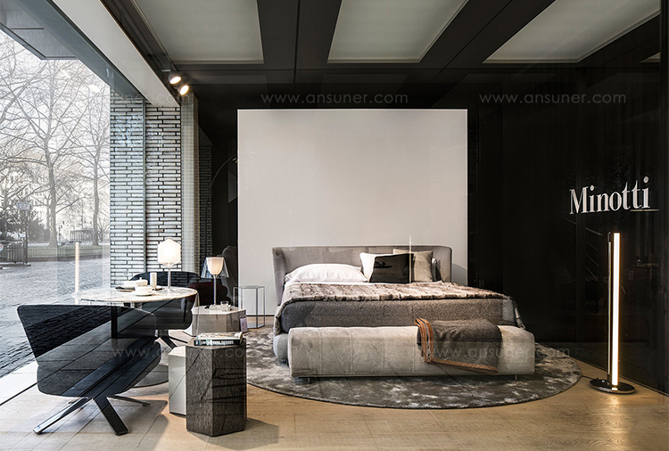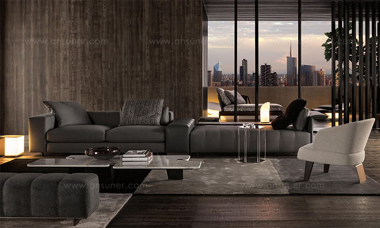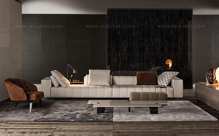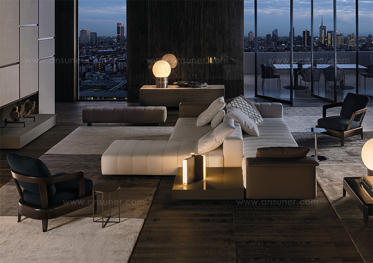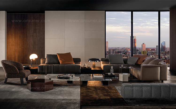 弗里曼“裁缝”项目的理念和原创性在其衍生系列弗里曼“休息室”中也有所体现。弗里曼“休息室”沙发纵深度有所降低,不仅更易搭配较小的居住空间,还可以用在接待场所,如等候室、前台区域、行政办公室。单组沙发的特点在于采用规则图形纹样的优雅缝线设计,可以自由随性地组合沙发,打造灵动的造型。“Wing”扶手拥有轻盈的线条,这要得益于采用聚氨酯为基材的泡沫金属框架。精致的包覆材料展现出公司运用复杂面料进行剪裁加工的实力。皮革和织物面料的各个部件通过浅铜色人造皮革束带和双缝线工艺连接在一起,打造出独特的纵深效果。