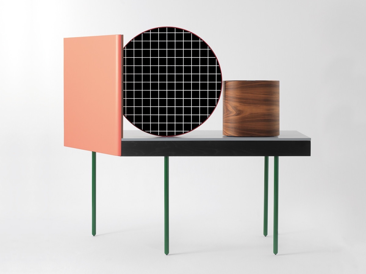 CHANDLO-实心灰烬结构,黑色磨砂。桌腿为管状钢,涂有亮绿色。实心,紧凑的桌面(混合了天然矿物和聚合物)为浅灰色。中央正面镜,由钢架组成,涂有红色。镜子的背面是黑色的MDF,表面涂有鲜艳的白色图案。侧镜具有过滤后的玫瑰色。珠宝盒胶合板(玫瑰木)