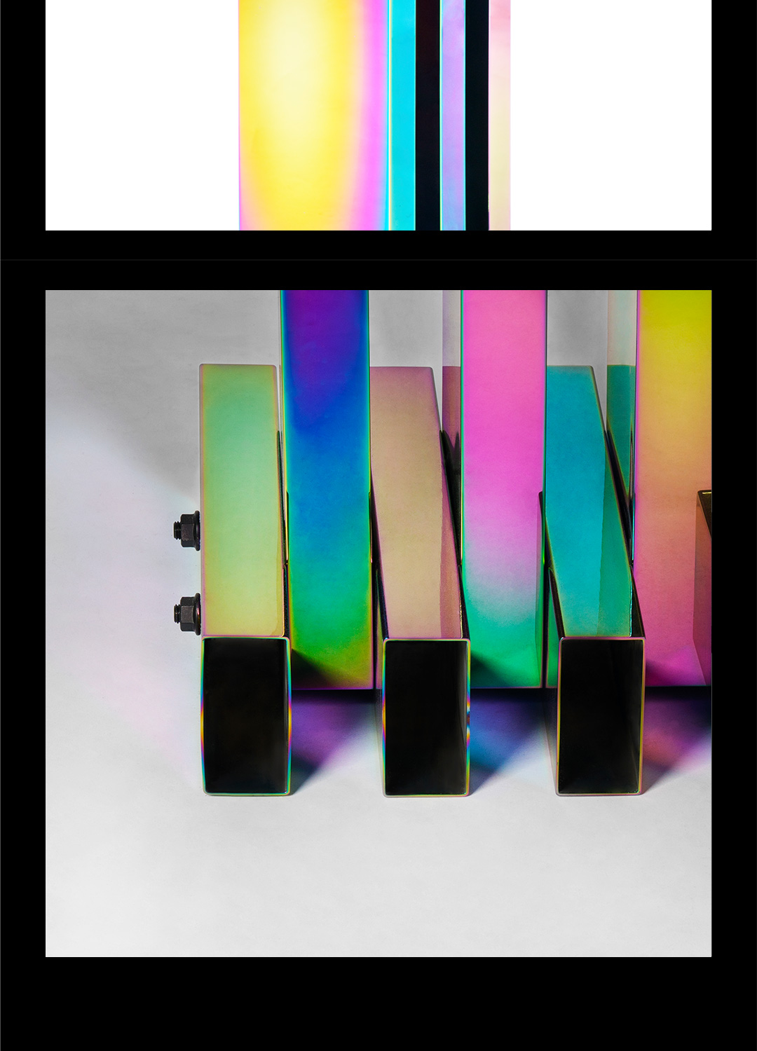 成熟常态的工艺完成规律性标准的矩形折面,与不可确定变幻成色的电镀技术,理性与非理性交集的不可控结果——不造,非常态。