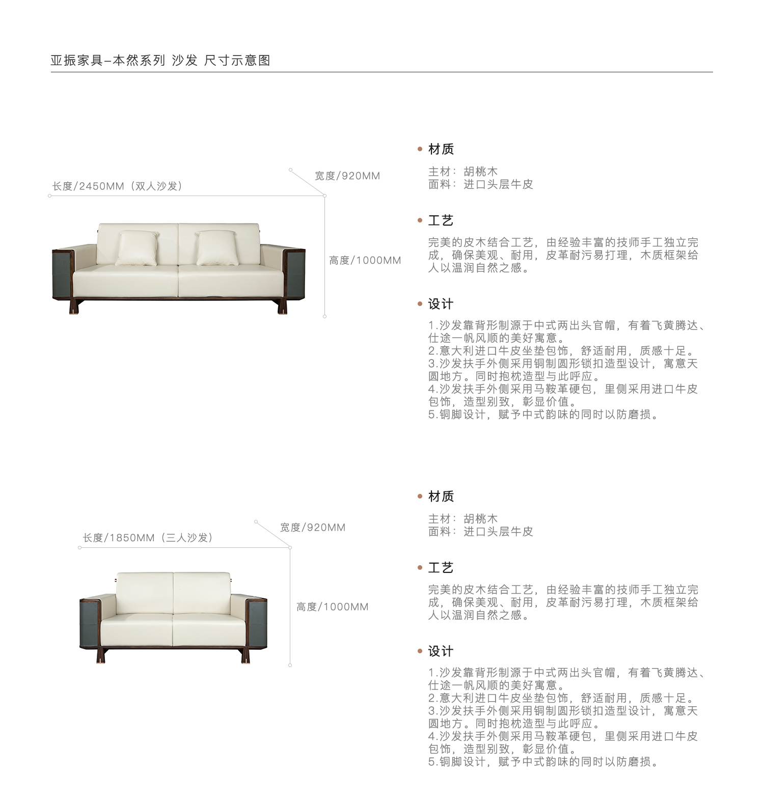 1.沙发靠背形制源于中式两出头官帽,有着飞黄腾达、仕途一帆风顺的美好寓意。 2.意大利进口牛皮坐垫包饰,舒适耐用,质感十足。 3.沙发扶手外侧采用铜制圆形锁扣造型设计,寓意天圆地方。同时抱枕造型与此呼应。 4.沙发扶手外侧采用马鞍革硬包,里侧采用进口牛皮包饰,造型别致,彰显价值。 5.铜脚设计,赋予中式韵味的同时以防磨损。