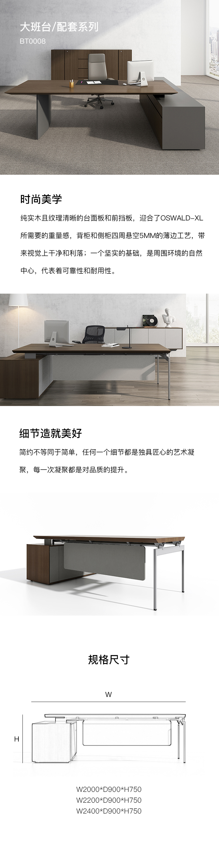 纯实木且纹理清晰的台面板和前挡板,迎合了OSWALD-XL 所需要的重量感,背柜和侧柜四周悬空5mm的薄边工艺,带 来视觉上干净和利落;一个坚实的基础,是周围环境的自然 中心,代表着可靠性和耐用性。