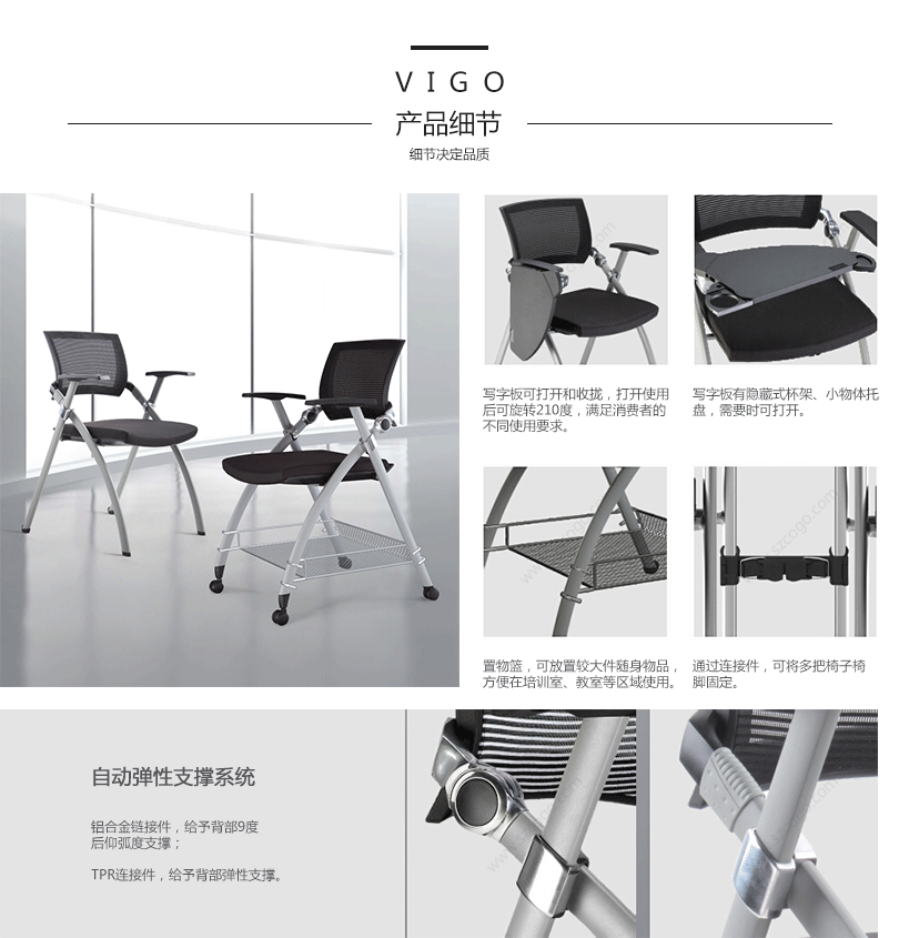 Vigo是业内第一款兼顾培训与会客功能的现代办公座椅,整椅外观简洁雅致,设计巧妙。精巧的悬浮背板链接铝合金枢轴可随人体坐姿变化,紧密贴合用户后背,为长时间培训、会谈提供人性化的座椅体验;会谈或培训后,可将Vigo座板折叠收纳,节省办公空间。