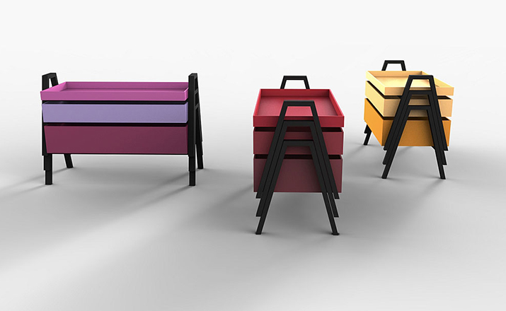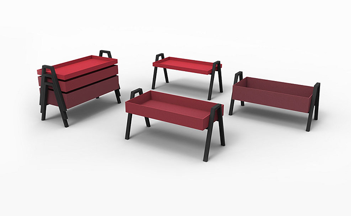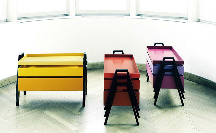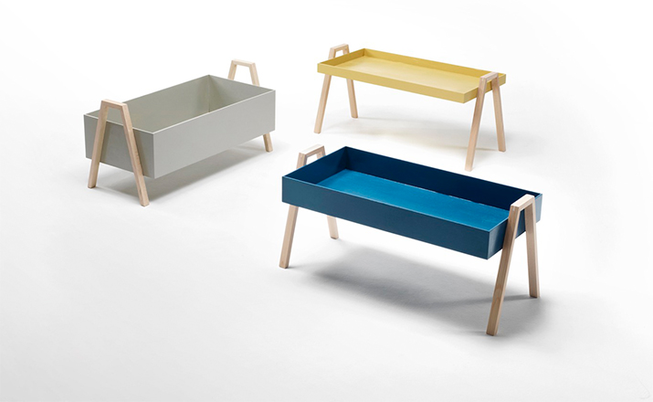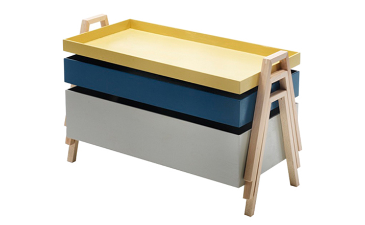 table composed of three containers of different heights in a barrel between them.legs in massello beech lacquered.plans in multilayer containers birch enamelled,set at each base.available in three variants of three colors each.