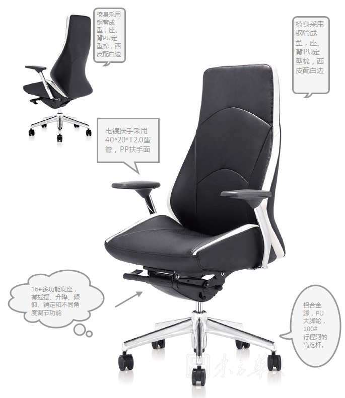 A:椅身采用钢管成型,座、背PU定型棉,西皮配白边,用铝合金脚,PU大脚轮,100#行程阿的高汔杆。