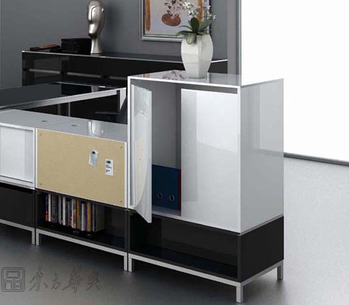 单元柜有标准的下文件柜、上文件柜、、电脑柜、衣柜可供配置,上文件柜又有软木背板、白板背板、铝沟槽背板可供选择。