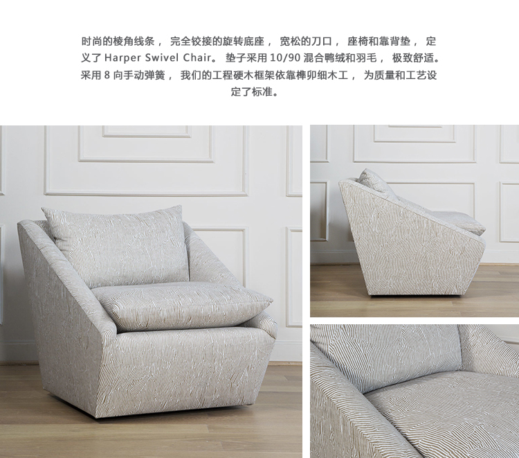 时尚的棱角线条,完全铰接的旋转底座,宽松的刀口,座椅和靠背垫,定义了Harper Swivel Chair。 垫子采用10/90混合鸭绒和羽毛,极致舒适。 采用8向手动弹簧,我们的工程硬木框架依靠榫卯细木工,为质量和工艺设定了标准。 提供精选的面料和皮革选择。