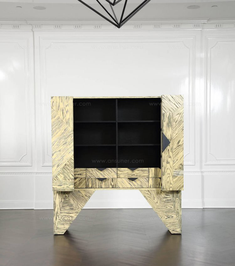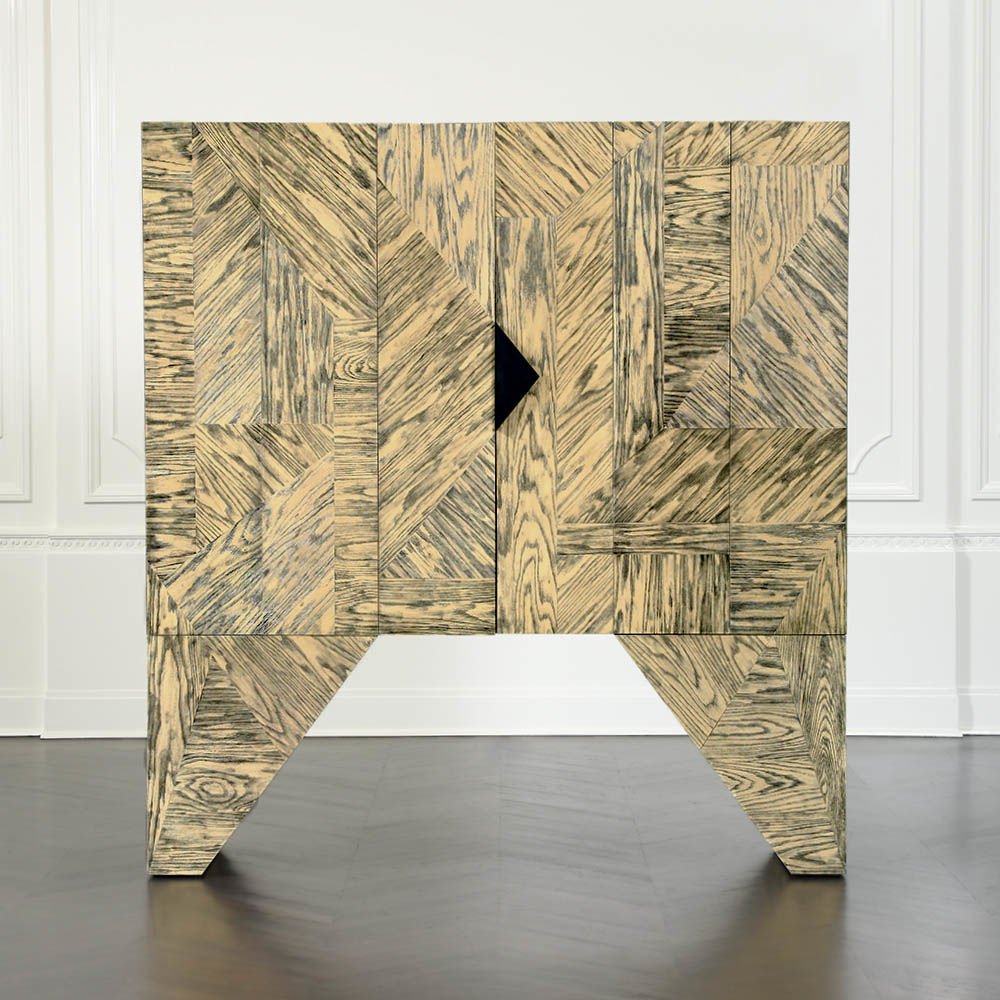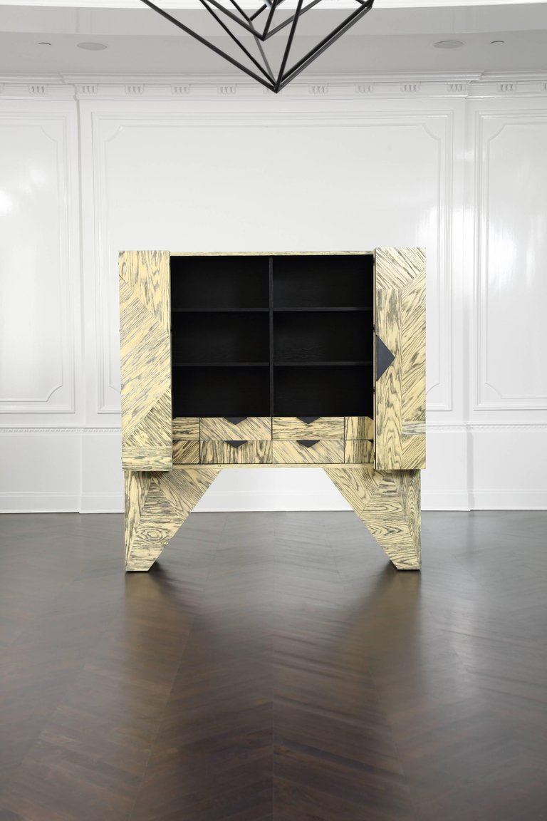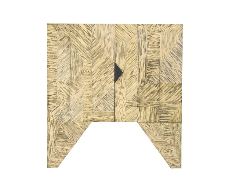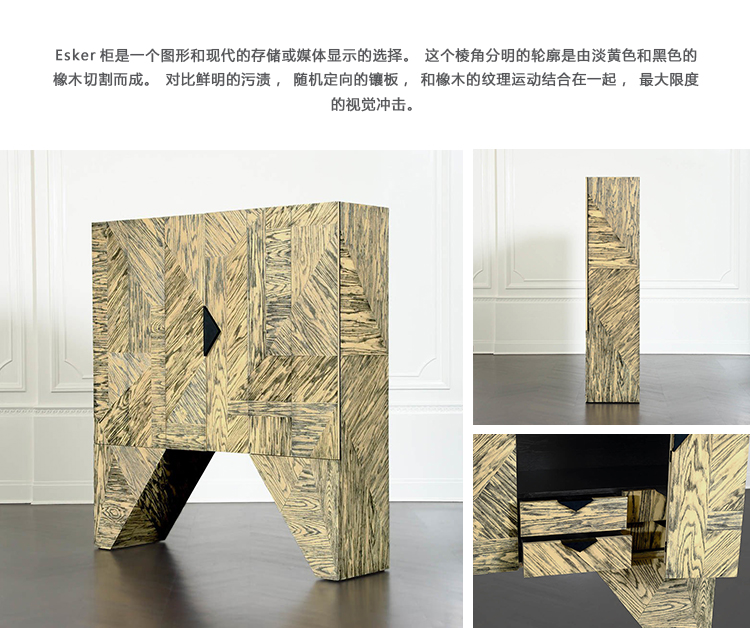 Esker柜是一个图形和现代的存储或媒体显示的选择。这个棱角分明的轮廓是由淡黄色和黑色的橡木切割而成。对比鲜明的污渍,随机定向的镶板,和橡木的纹理运动结合在一起,最大限度的视觉冲击。在Z折叠门后面,室内提供了8个内衬抽屉,黑色的钢五金件和两对可移动的实木架子。