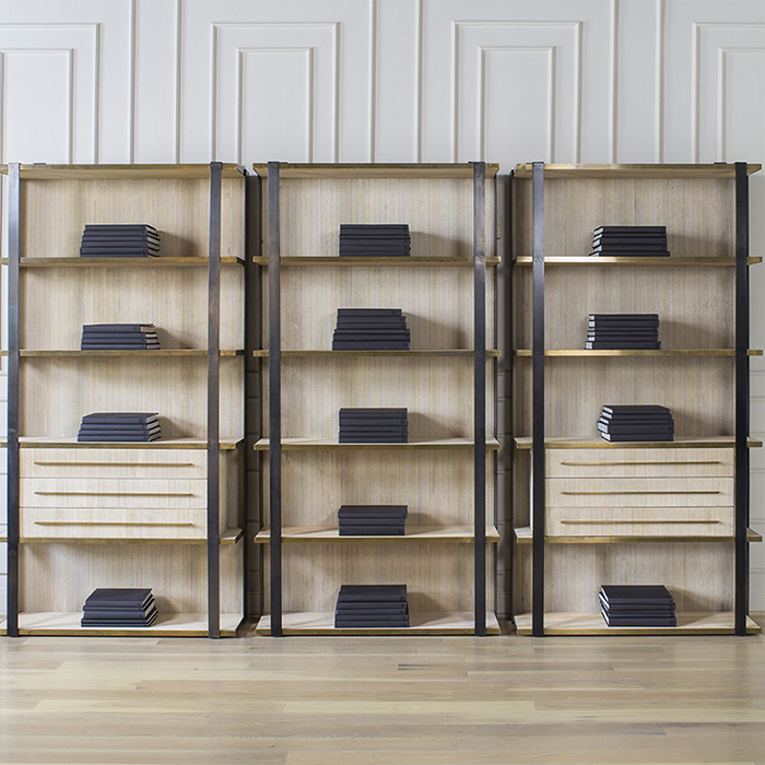 凭借Kelly对混合金属和材料并列的喜爱,富兰克林橱柜由黑色钢架,漂白的胡桃木制成,架子上饰有抛光青铜。 橱柜配有三个抽屉,四分之一英寸铣削青铜拉手,外观大胆,精致,现代。