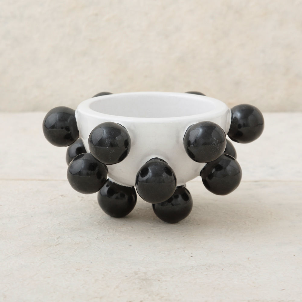 我们的流行碗是手工雕刻和手绘的哑光黑色和白色釉。有趣而又复杂,这款产品将给任何桌面带来活力。