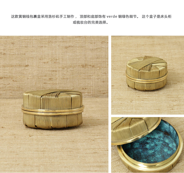 这款黄铜线包裹盒采用洛杉矶手工制作,顶部和底部饰有verde铜绿色细节。 这个盒子是床头柜或梳妆台的完美选择。