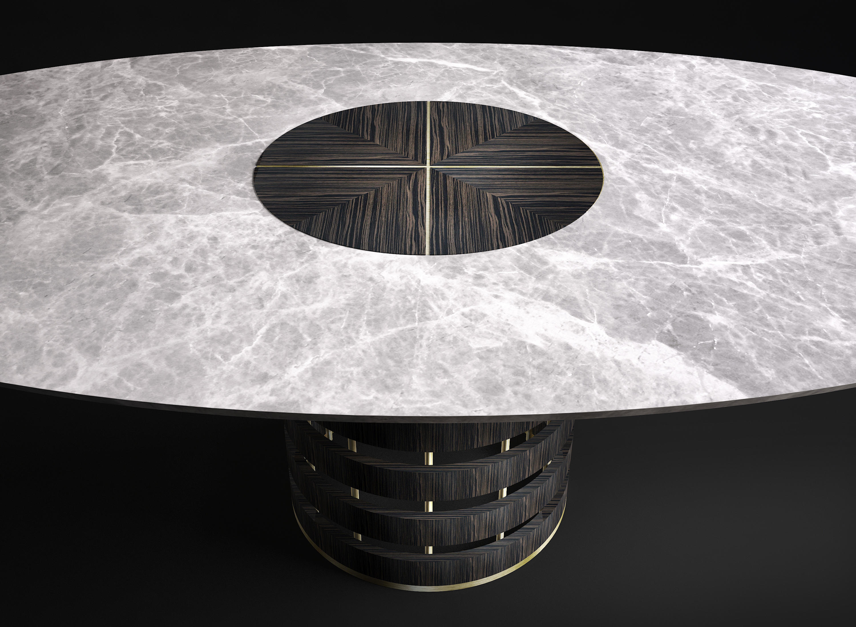 华丽华丽的桌子;木质结构支撑着椭圆形的灰色大理石桌面。同样的装饰让人想起顶部的图案,薄薄的黄铜条交织在一起,呈现出不同寻常的优雅。实体空间和空洞空间的交替与顶部的坚固性相矛盾,确实带来了意想不到的轻盈感。