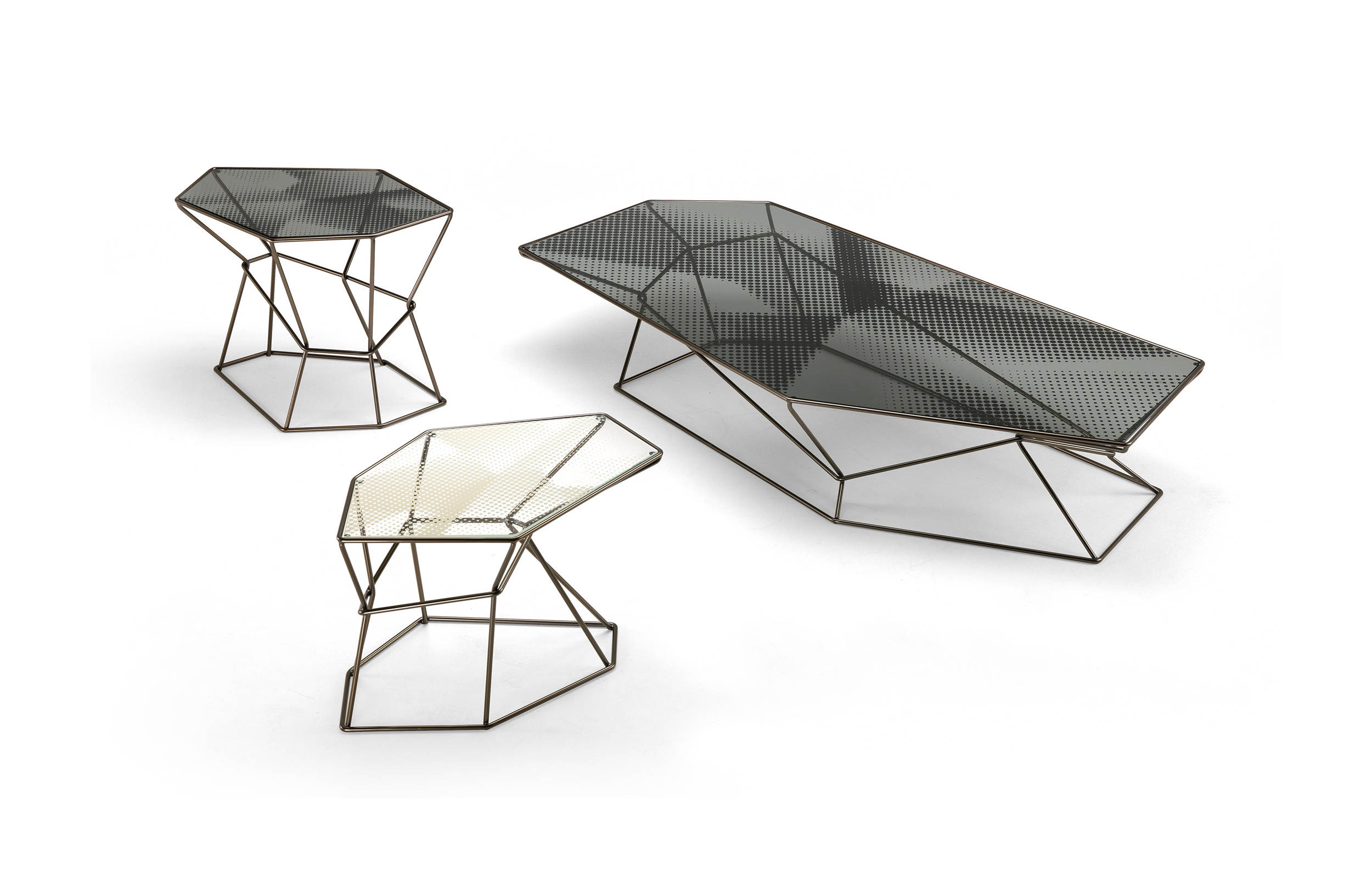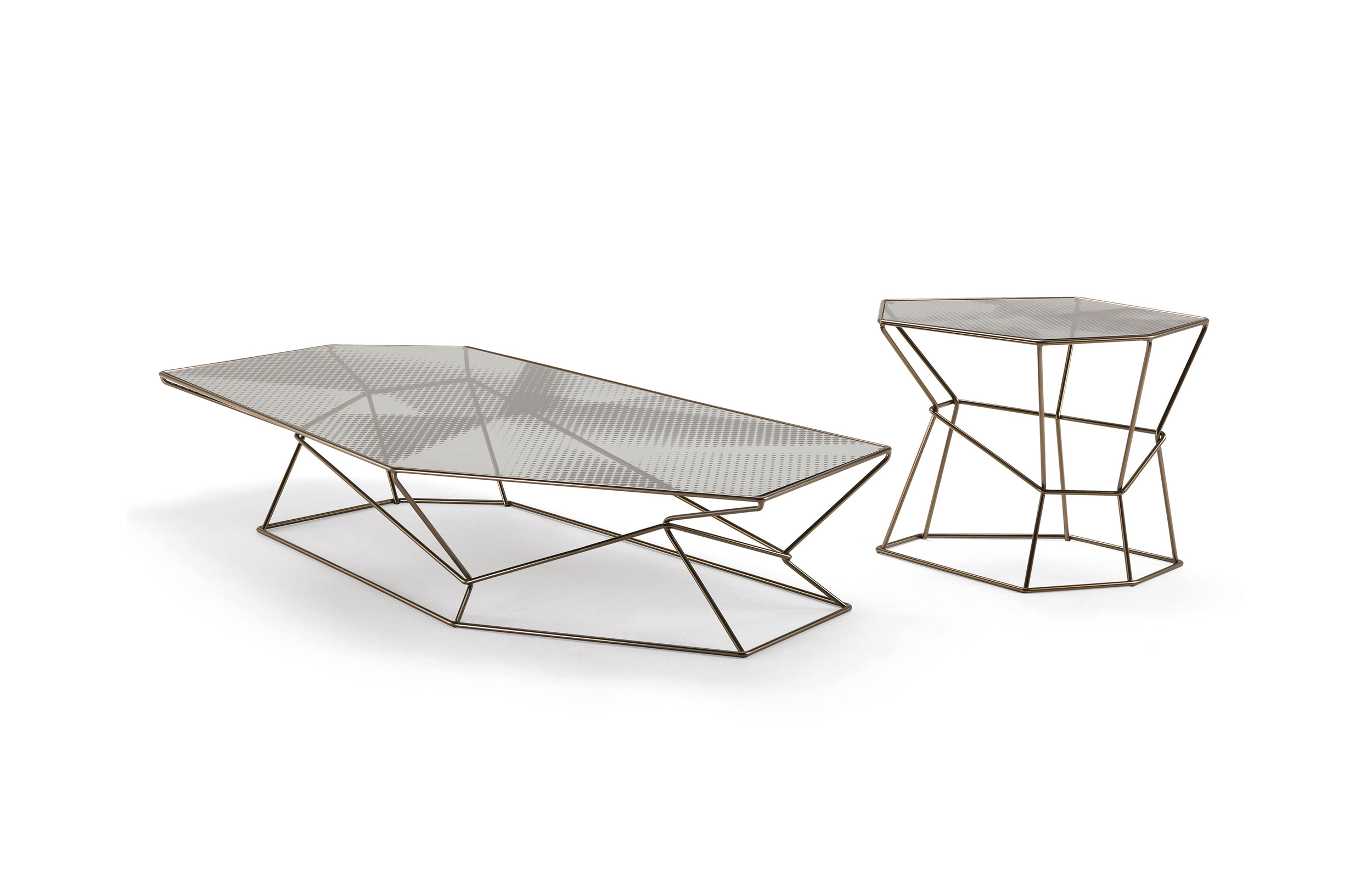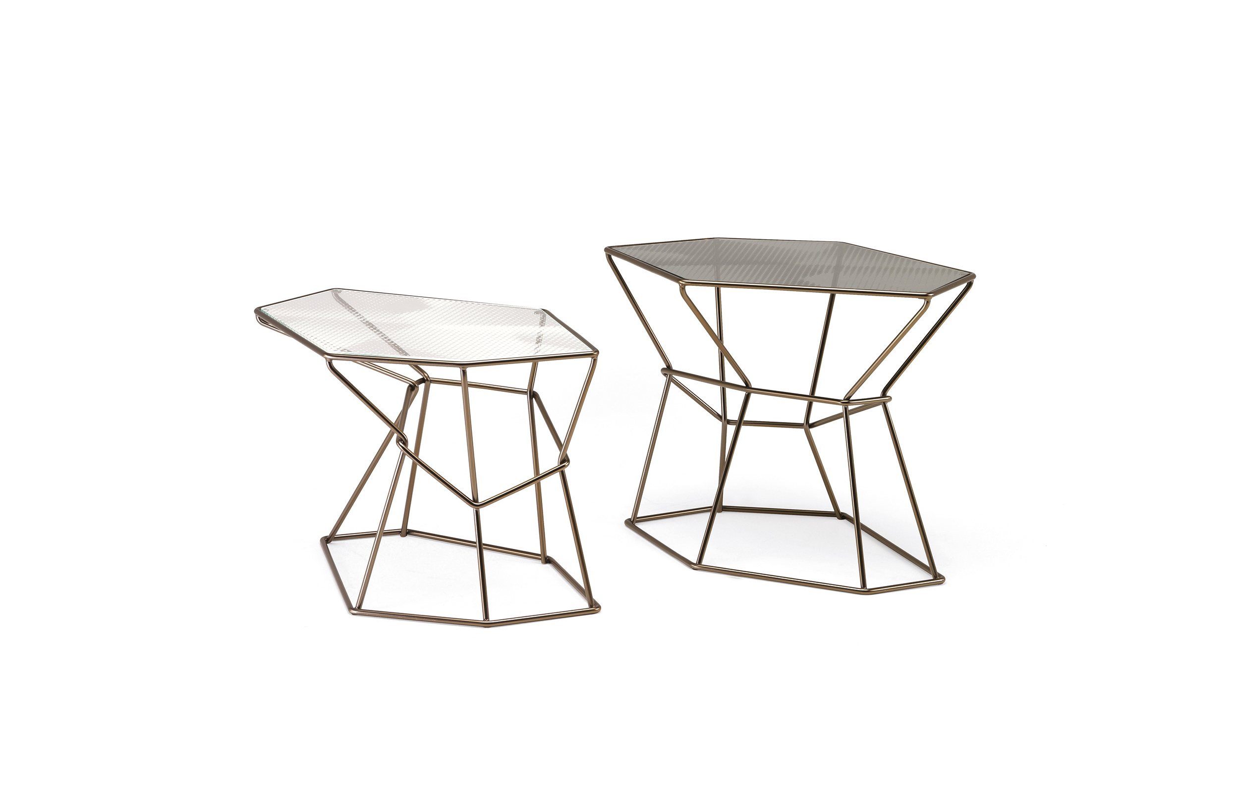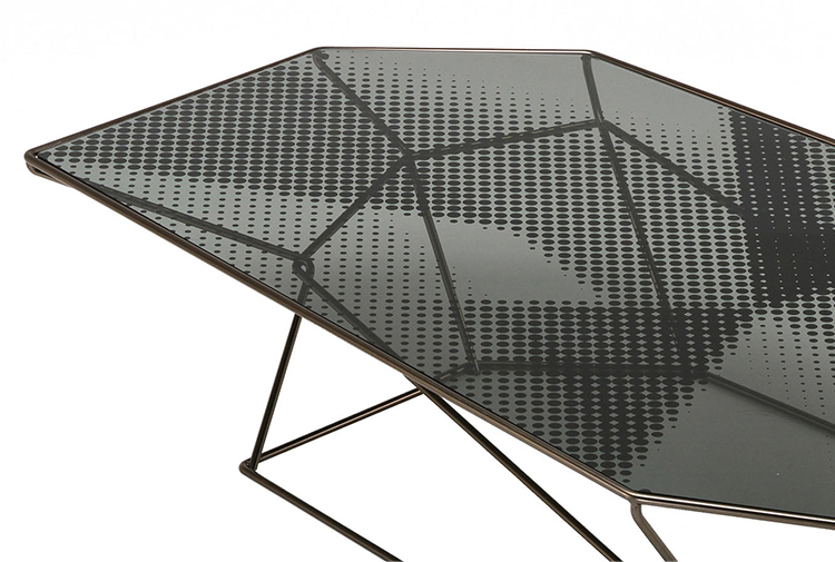 马洛·利帕利尼(Mauro Lipparini)的这款“倒车矮桌”(Rebus low tables)有金属结构,云母棕色的染色或镀锌的钛,以及一层金属丝的玻璃。结构和顶部都有不规则的形状,形成一种不寻常的交织。