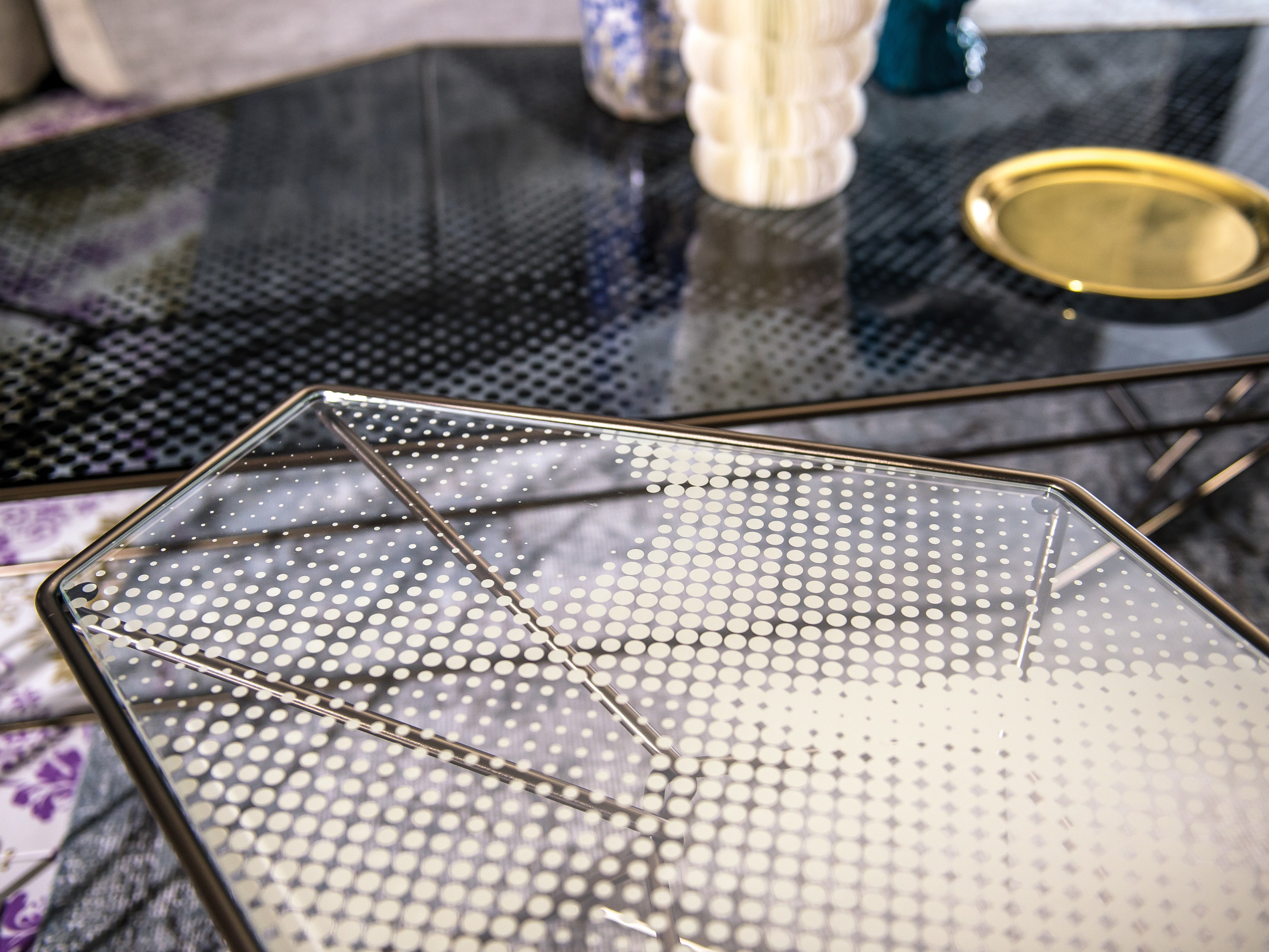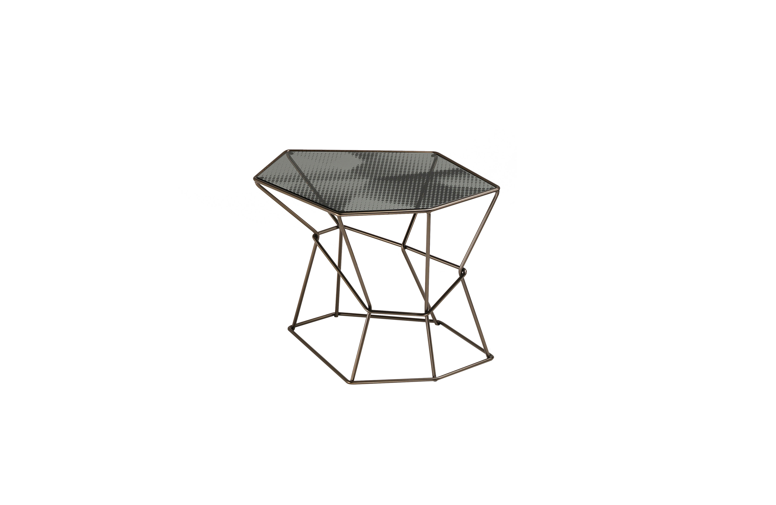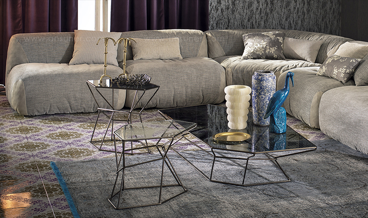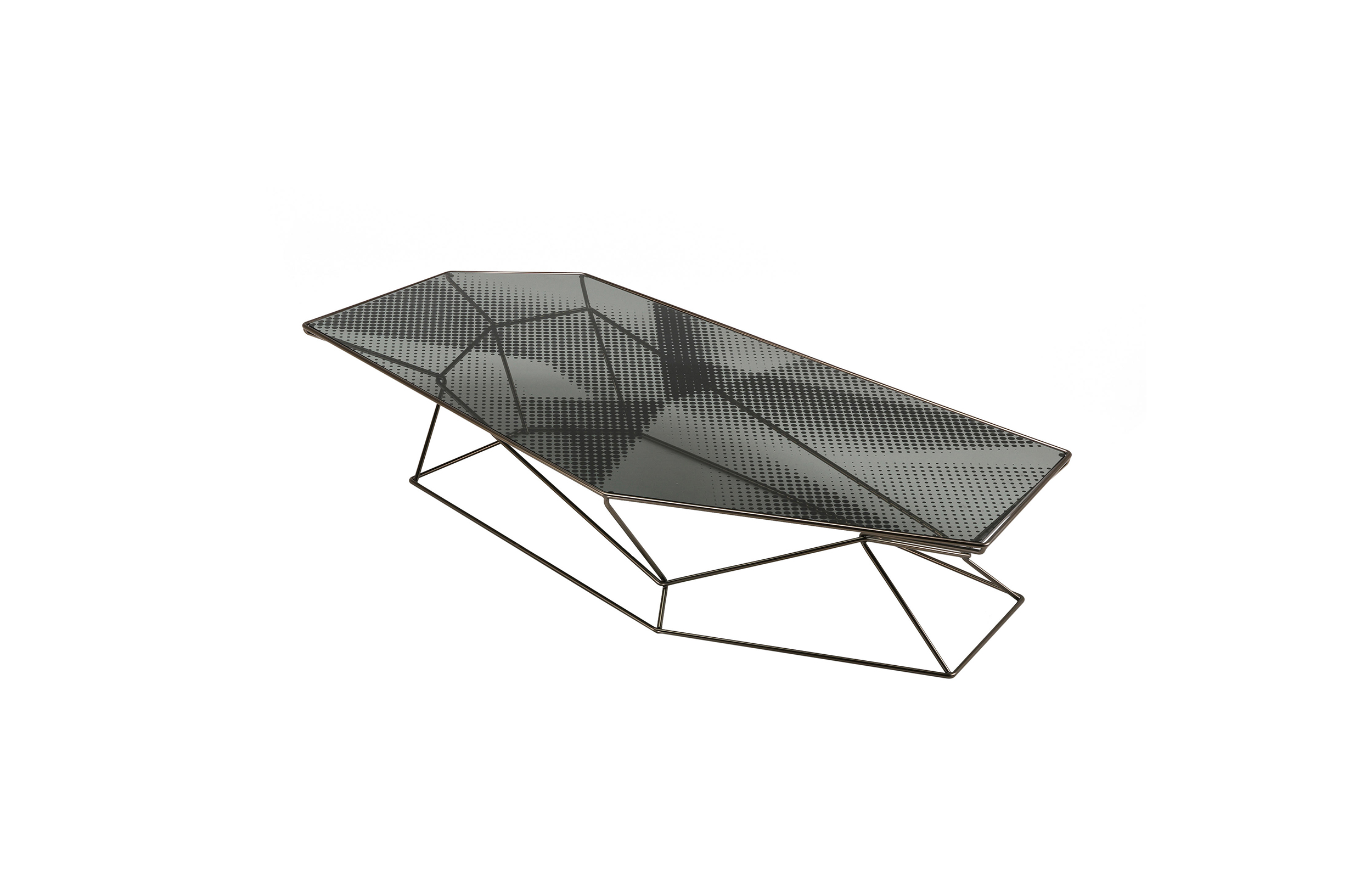 马洛·利帕利尼(Mauro Lipparini)的这款“倒车矮桌”(Rebus low tables)有金属结构,云母棕色的染色或镀锌的钛,以及一层金属丝的玻璃。结构和顶部都有不规则的形状,形成一种不寻常的交织。