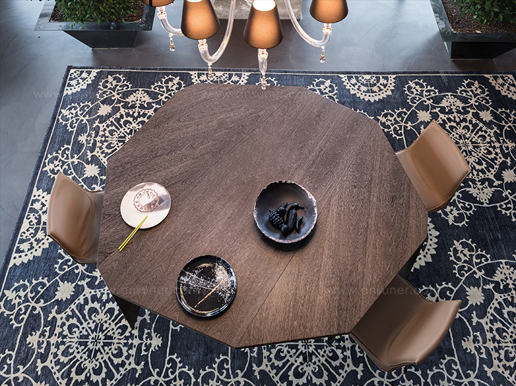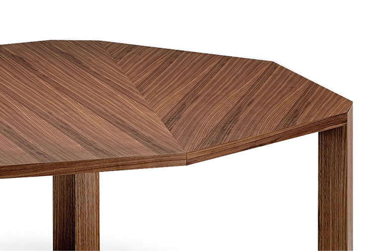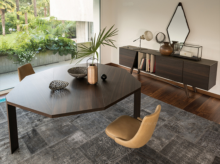 这张餐桌因其独特的八角形当代设计和个性而引人注目。ig XXL是独一无二的,因为它只有三条腿。具有多面的镶嵌面的桌面允许它在房间不同的位置上进行陈列,或一面靠在墙壁,或放在客厅里。它是由MDF镶嵌在卡纳莱托胡桃木、橡木或苏皮亚木中制成的。