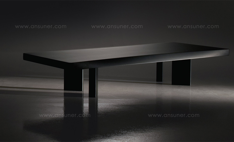采用哑光黑色的珍贵木材或黑色实木橡木或美国黑胡桃木制造的矮桌。桌面厚度和凹面刻画了正式用语中的模型特征,并创造了令人讶异的轻盈感。该款矮桌是于1969年为日本驻巴黎大使馆设计的,这款咖啡桌是技术和中继合成的胜利。