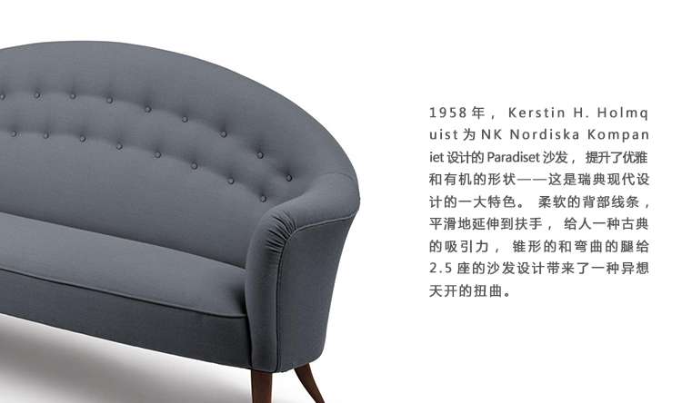 1958年,Kerstin H. Holmquist为NK Nordiska Kompaniet设计的天堂沙发,提升了优雅和有机的形状——这是瑞典现代设计的一大特色。柔软的背部线条,平滑地延伸到扶手,给人一种古典的吸引力,锥形的和弯曲的腿给2.5座的沙发设计带来了一种异想天开的扭曲。
