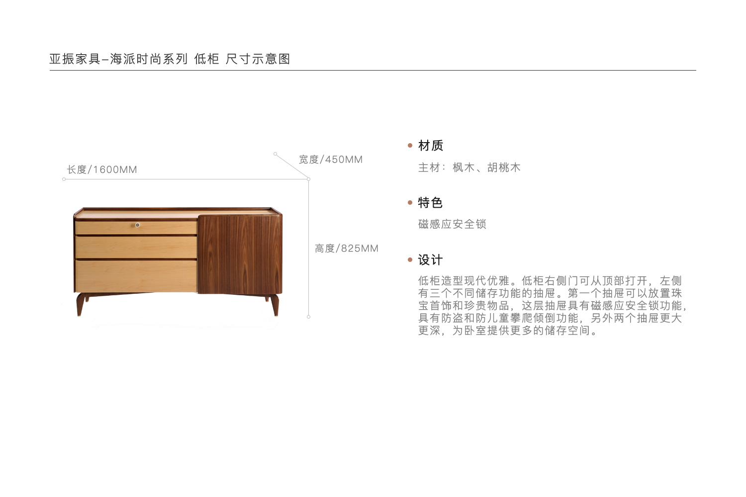 低柜造型现代优雅。低柜右侧门可从顶部打开,左侧有三个不同储存功能的抽屉。第一个抽屉可以放置珠宝首饰和珍贵物品,这层抽屉具有磁感应安全锁功能,具有防盗和防儿童攀爬倾倒功能,另外两个抽屉更大更深,为卧室提供更多的储存空间。