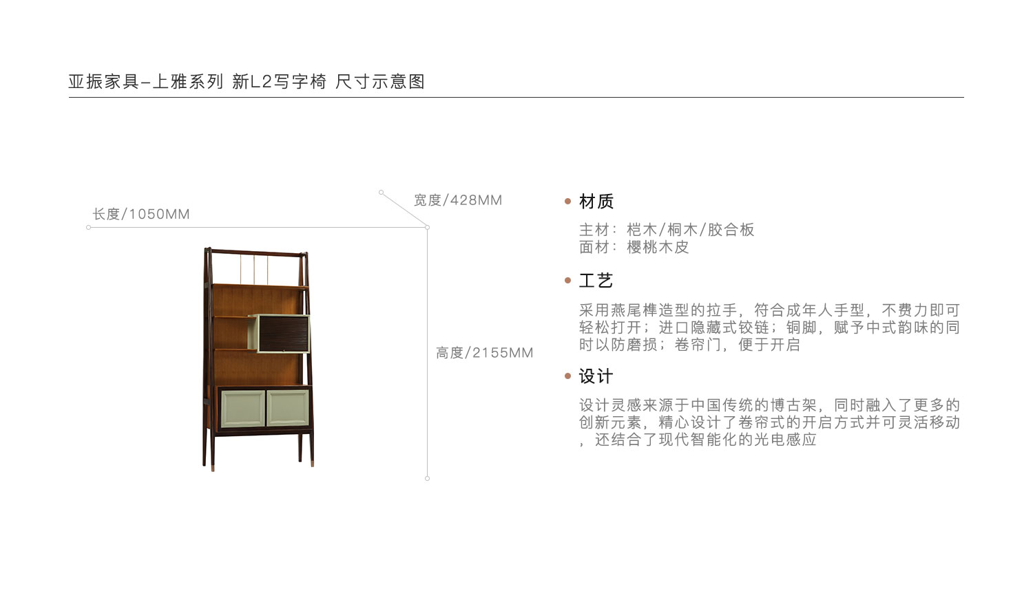 采用燕尾榫造型的拉手,符合成年人手型,不费力即可轻松打开;进口隐藏式铰链;铜脚,赋予中式韵味的同时以防磨损;卷帘门,便于开启。设计灵感来源于中国传统的博古架,同时融入了更多的创新元素,精心设计了卷帘式的开启方式并可灵活移动,还结合了现代智能化的光电感应。