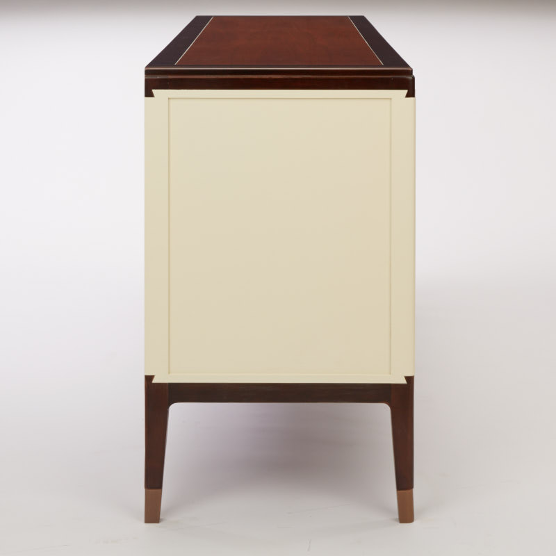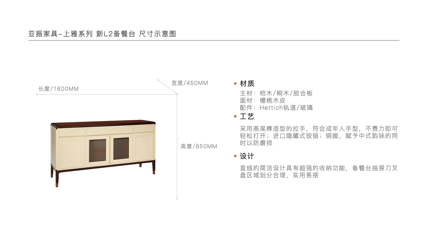 采用燕尾榫造型的拉手,符合成年人手型,不费力即可轻松打开;进口隐藏式铰链;铜脚,赋予中式韵味的同时以防磨损。直线的简洁设计具有超强的收纳功能,备餐台抽屉刀叉盘区域划分合理,实用易搭。