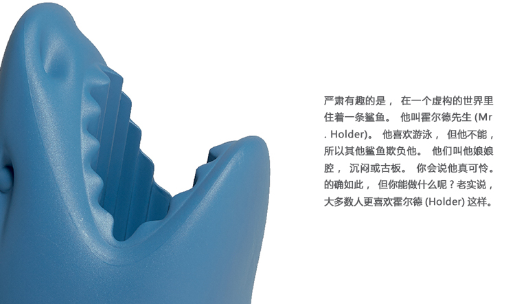 严肃有趣的是,在一个虚构的世界里住着一条鲨鱼。他叫霍尔德先生(Mr. Holder)。他喜欢游泳,但他不能,所以其他鲨鱼欺负他。他们叫他娘娘腔,沉闷或古板。你会说他真可怜。的确如此,但你能做什么呢?老实说,大多数人更喜欢霍尔德(Holder)这样。