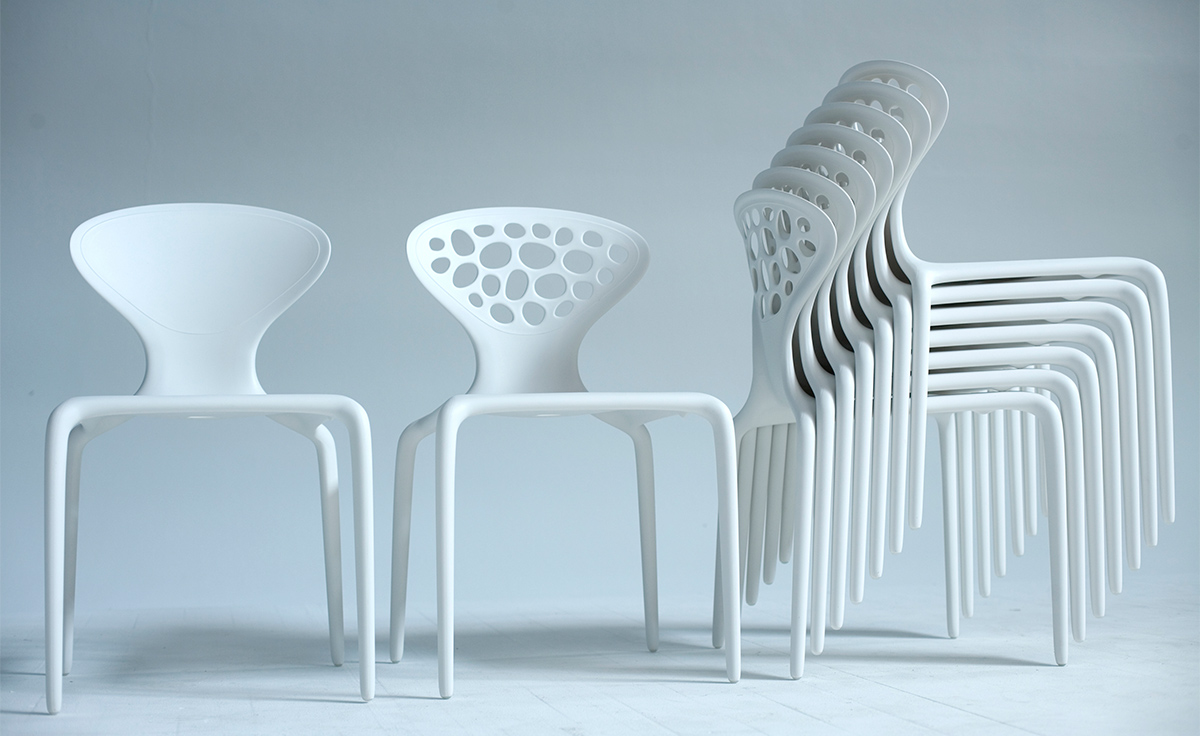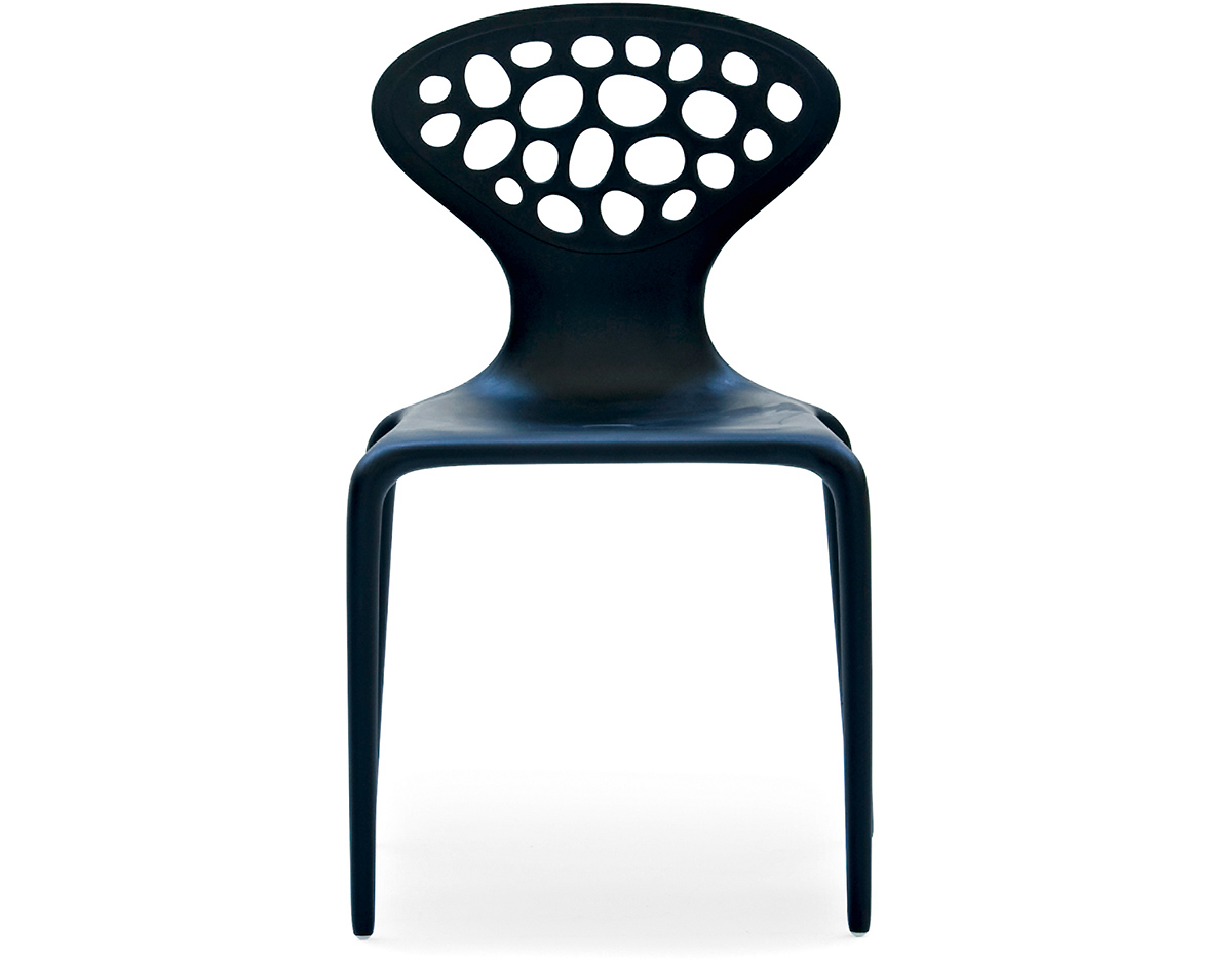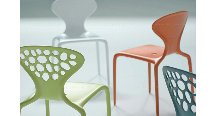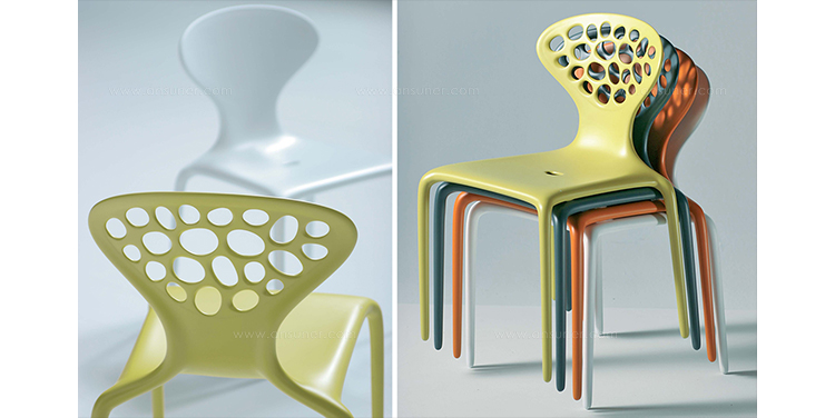"Supernatural Chair(超自然椅)是意大利设计师Ross Lovegrove于2005年设计的作品,它是一个非常重要的创新,它使用注塑技术将玻璃纤维聚脂化合物塑造成型。这张新式的可层叠的椅子代表着新的视觉形式,数字化的生成,在它被使用的每一天都能感觉到,纤细的、活泼的、有益于健康。超自然椅传承了Lovegrove的有机性感的曲线,苗条、具有生命力。结合了人体解剖美学和先进制造技术,用两层的玻璃纤维增强的PM聚胺来调和内部结构框架和外表美学要求。超自然椅有着迷人的外形曲线,椅背不规则的圆洞有如外星空中的黑洞般神秘,又像大自然中随处可见的鹅卵石般清新自然,所以超自然椅所显现的气质是那么的与众不同。超自然椅,可堆叠,非常适合在户外的餐会、露天咖啡座、休闲场所,以及居室的餐厅、会议室、接待室等场所使用。"