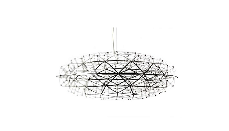 "The Raimond lamp:a perfect sphere of mathematical ingredients punctuated by tiny led lights. Looking at the lamp feels like staring into the soft glow of a starry night. Into the essence." Material: Stainless ‘spring steel