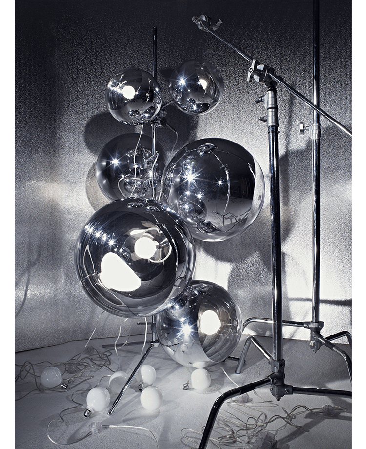 "A highly reflective shade inspired by the space helmet. The Mirror Ball is created by exploding a thin layer of pure metal onto the internal surface of a polycarbonate globe. This has become one of the most iconic products in the Tom Dixon collection. Offered in two sizes.The Fat Spot Light was manufactured using a special vacuum metallization process which has been developed over a number of years by Tom Dixon in partnership with their factory. The technically complex nature of this process (i.e applying a very thin layer of real metal to the internal surface of a polycarbonate form, which is then UV coated) requires highly skilled workers, specific machinery and clean environments to meet demanding quality levels. Metalized polycarbonate products must only be stored & installed in temperature controlled environments to preserve the quality of the product. Please take greater care when handling and installing.