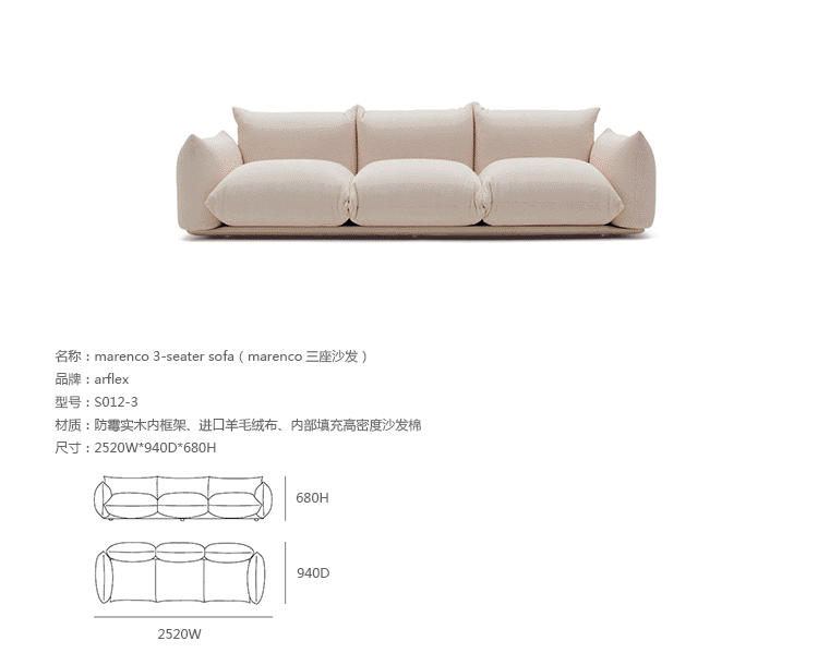 "marenco sofa系列沙发由设计师Mario Marenco在1971年所推出,Arflex公司出品,有单座,双座,三座,和五座组合形式。这款经典的沙发线条经典,舒适度饱满,成为摩登家居用品经典作之一。外型以简约细腻的北欧设计为方向,轻盈的金属脚架与薄型扶手,在厚薄粗细之间,视觉比例的层迭丰富,融合义式沙发中柔软舒适的元素,靠垫内衬高密度泡棉,兼具支撑性与松软度。这套沙发采用革命性的方式组合,垫子及扶手都是独立的部分。枕头是挤压钢管的金属框架,提供了刚性和耐用性。胶合板基地加上纤维覆盖。制作采用防霉实木内框架、进口羊毛绒布、内部填充高密度沙发棉,保证了高品质的奢华与舒适。