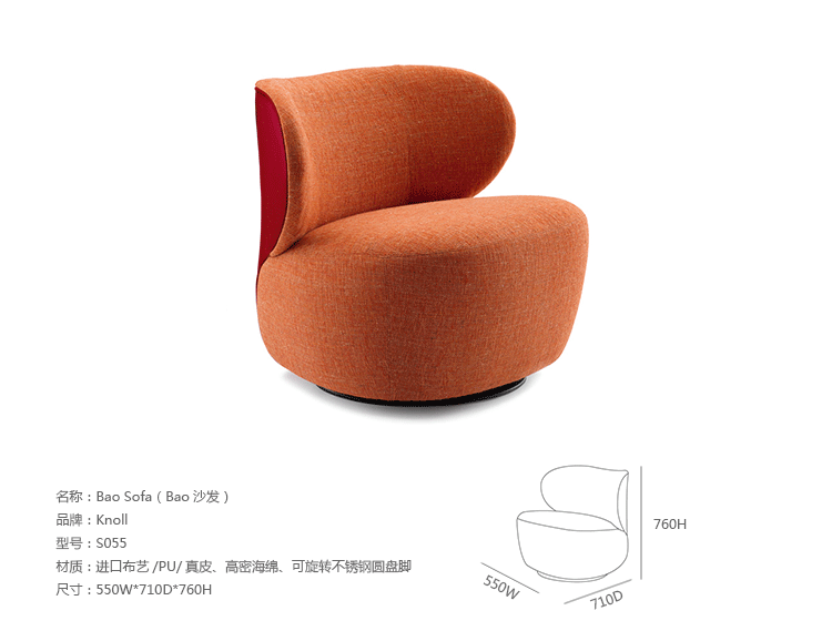 "宽敞和圆润,优美的曲线设计正是Bao Sofa(Bao沙发)最吸引人的地方。华丽的雕塑艺术的靠背,皮革拼凑在一起形成一个球状的样子。流畅的线条--简洁和优雅。扶手椅上结合材料,同时保持它们鲜明︰优雅马鞍皮革座椅背,纺织着天然织物。Bao Sofa(Bao沙发)就像给您一个欢迎的拥抱。新颖独特扪面方式:织物和皮革组合,扶手及整个座椅完全覆盖在织物或皮革。"
