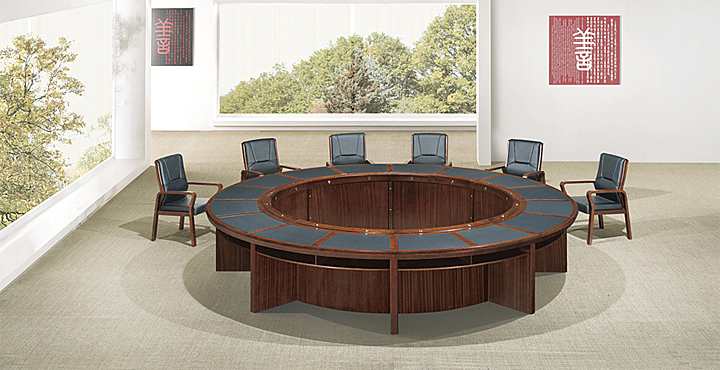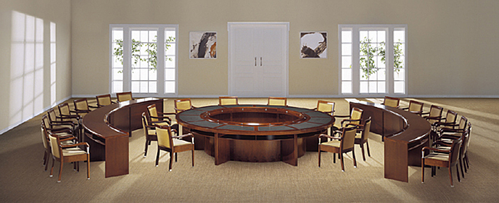 ※  实木的会议桌由传统的板形基座承托,桌边微弯,与人坚稳厚重之感;外围为弧形的会议条桌!