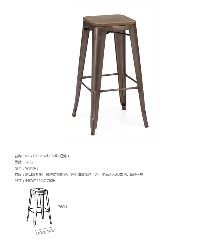 tolix chair(tolix椅)一把有味道、有态度的椅子,据说它最开始被使用在一艘战舰的天气预报房间里,故事的真实性与否不得而知,但是不影响其成为享誉世界的著名设计家具,1934年由Xavier Pauchard设计,早期是作为户外用家具设计,力图展现法式慵懒而闲适的气质,经年而来被全世界时尚设计师所宠爱,从室外扩展到家居、商业、展示等多个用途,而此椅也不负众望在各类空间中均有上佳表现,特别是近年来与混搭、乡村、美式、怀旧、北欧简约、中式等主要装修风格搭配,都呈现出独特的韵味,也被时尚界赞为“百搭第一”椅,可以用在酒吧,餐馆,咖啡馆等等地方,之后通过改进,设计出有扶手版本的tolix armchair(tolix扶手椅),高背版本的tolix high back bar stool(tolix高背吧凳),宽背版本的tolix wide back bar stool(tolix宽背吧凳),及tolix bar stool(tolix吧凳)和tolix mini stool(tolix迷你凳)。制作采用进口冷轧钢、磷酸防锈处理、静电油漆喷涂工艺、坐面为木板或PU海绵坐垫,颜色可选。