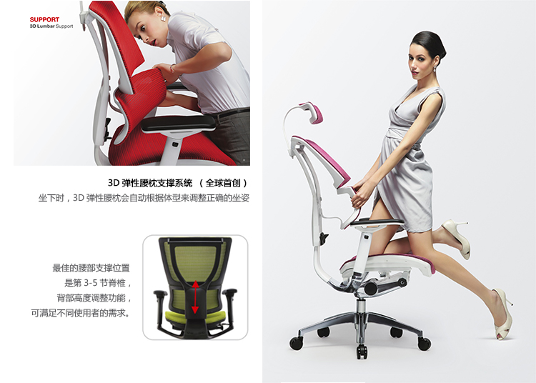 独特的3D弹性腰枕支撑系统,给予腰部三维动态的全方位的支撑;
