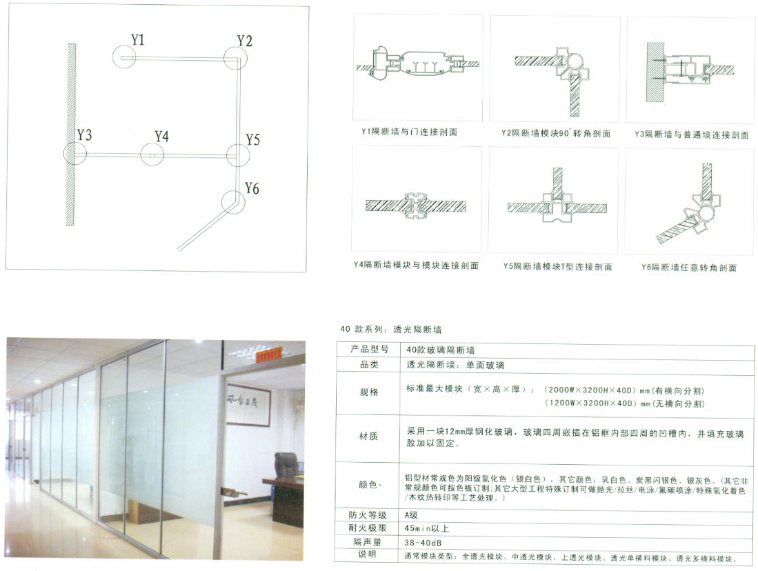 40单玻隔墙相关数据参数大致如下:隔墙高度可做到3.5米(常规做到3.2米),40单玻隔墙最大单跨度为1.5米(常规做1.2米),高度可做到3.5米(常规做3.2米),其壁槽为65mm(有时为设计的需要,可以用工字料当壁槽使用,工字料规格尺寸为:40*30),上下槽为65mm,单玻小柱为25mm,单玻走线槽为178mm,中间夹12mm厚的钢化玻璃,在玻璃材质选择上也是丰富多样的:清玻、磨玻、药水砂玻璃,艺术玻璃等等。