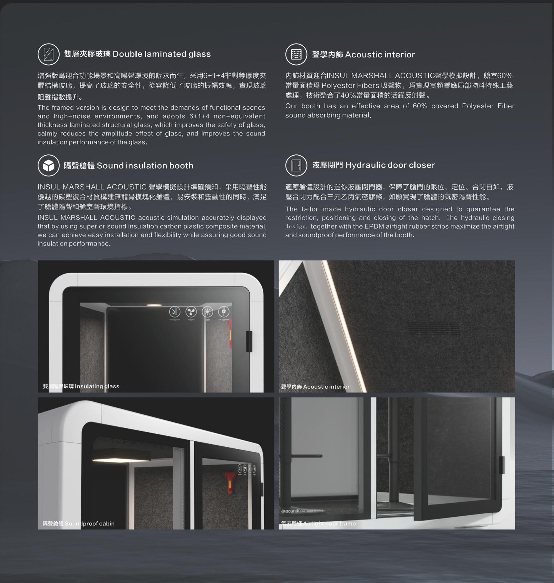 一个灵动的安静空间,满足您无限创想不传统的碳塑复合板、航空铝、隔声玻璃是它的主要组成,SOLIDWORKS软体力学建模让仓体组装仅需一种紧扣件,INSULMARSHALL ACOUSTIC 声学模拟设计准确预知并实现了舱体隔音和舱室音环境指标,它是一个强大,尽管它不是最完美的迷你空间,仓体采用可循环碳塑再生材料 SR系列 静音仓推崇低碳、简约、安全、实用主义优化非必要的功能和配置。从薄的全R角外观和互雅配色让它更精致、融入环境。